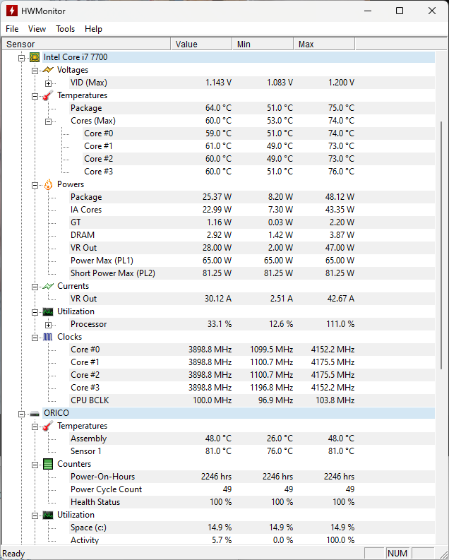 I tested the efficacy of the new thermal paste by opening nearly two dozen applications, including a live television stream, a Zoom video conference, my Outlook mail client, and three different web browsers. Before replacing the thermal paste, the CPU temperature would have spiked with this kind of load and the fan would have kicked in. With the new thermal paste, the temperature bumped up from about 50° C at idle (light load) to about 60° C (heavy load) as shown in HWMonitor below as temperatures for Cores 0, 1, 2, and 3. (At idle, the CPU runs between 39° C and 45° C, averaging about 42° C.)