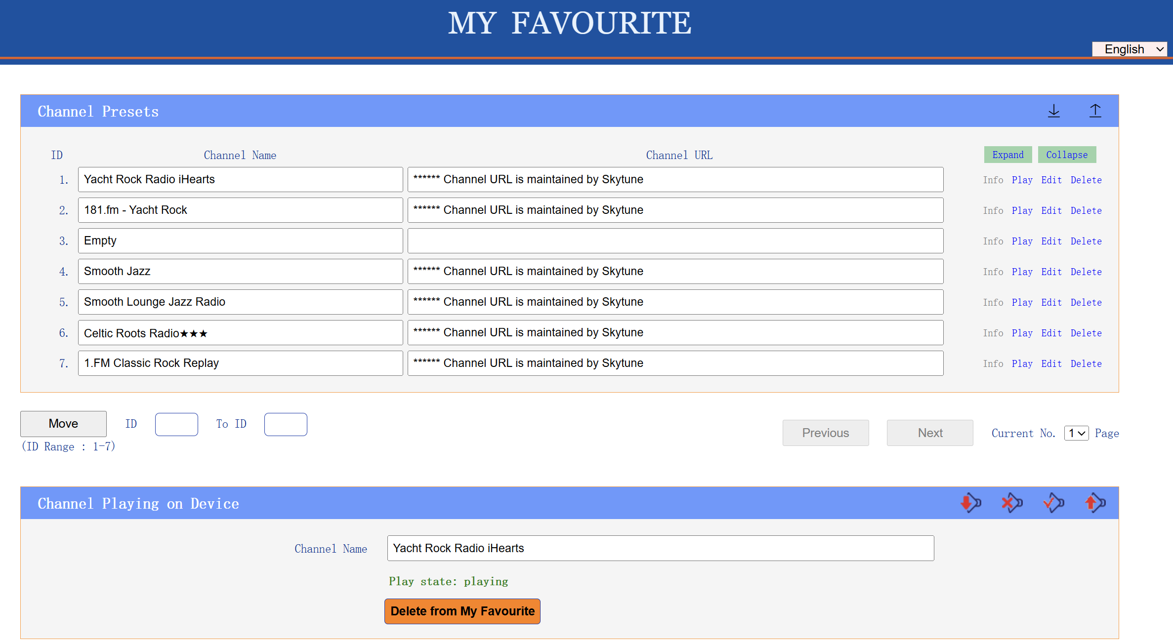 But there is more. Now that I have some favorite stations stored, I can play them by simply entering the radio’s IP address in my browser (or on my smartphone). This gives me a simple screen of my favorite stations, as shown below. I don’t have to get up, cross the room, and peer down at the small-ish display. I don’t have to find the remote. I can do it from where I’m working on my computer.