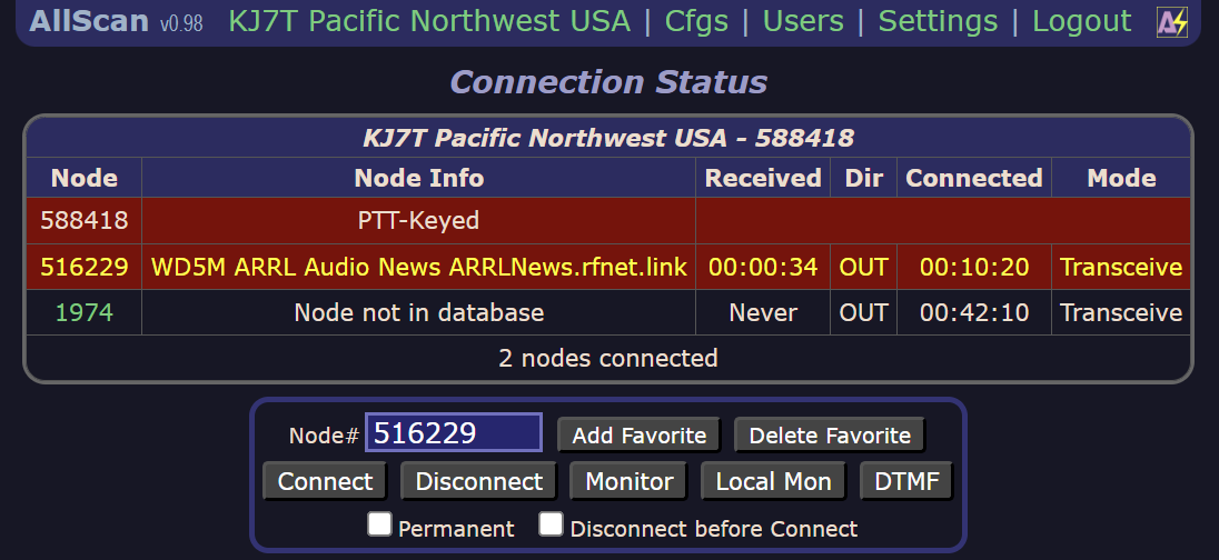 AllScan is a free and open-source web app that provides Favorites Management features, AllStarLink Stats integration, and connection monitoring and control functions.