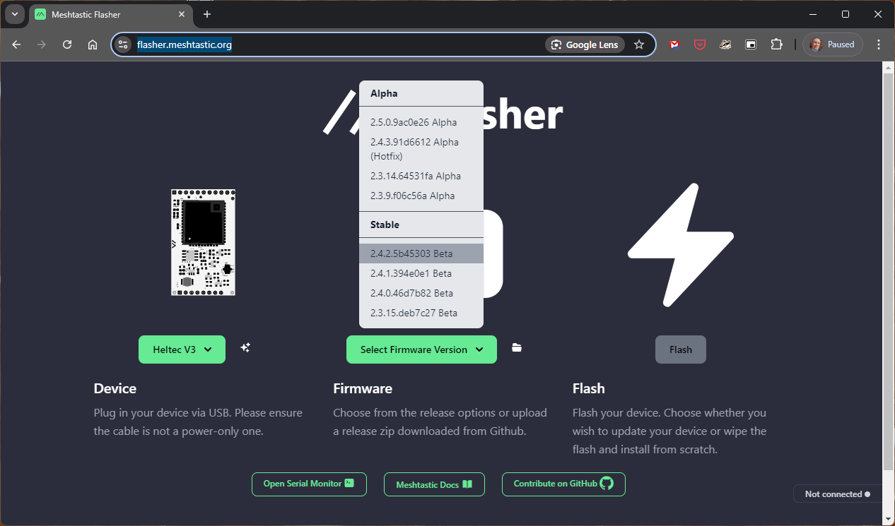To do this, I connect my node to a USB port on my personal computer, then open https://flasher.meshtastic.org. A prerequisite of this is installing a serial driver for your COM port that matches the type of device you’ll be flashing. I had already done this so I just had to select the correct COM port.
