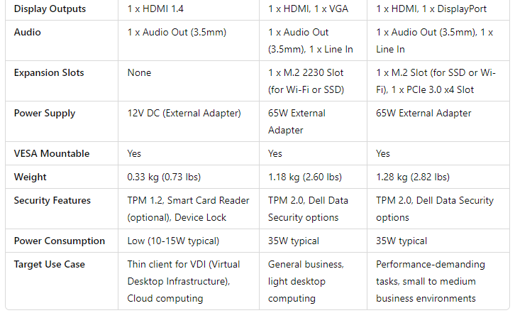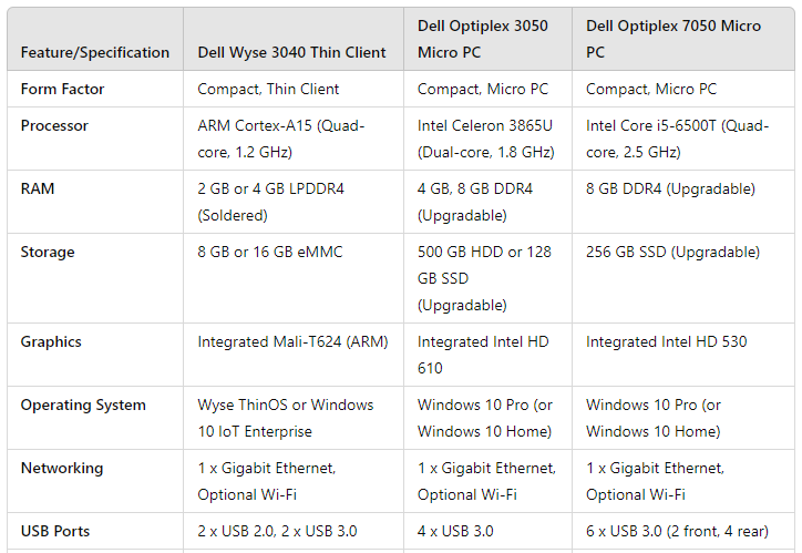 Here is a detailed comparison of the Dell Wyse 3040 Thin Client, the Dell Optiplex 3050 Micro PC, and the Dell Optiplex 7050 Micro PC based on their features and specifications:
