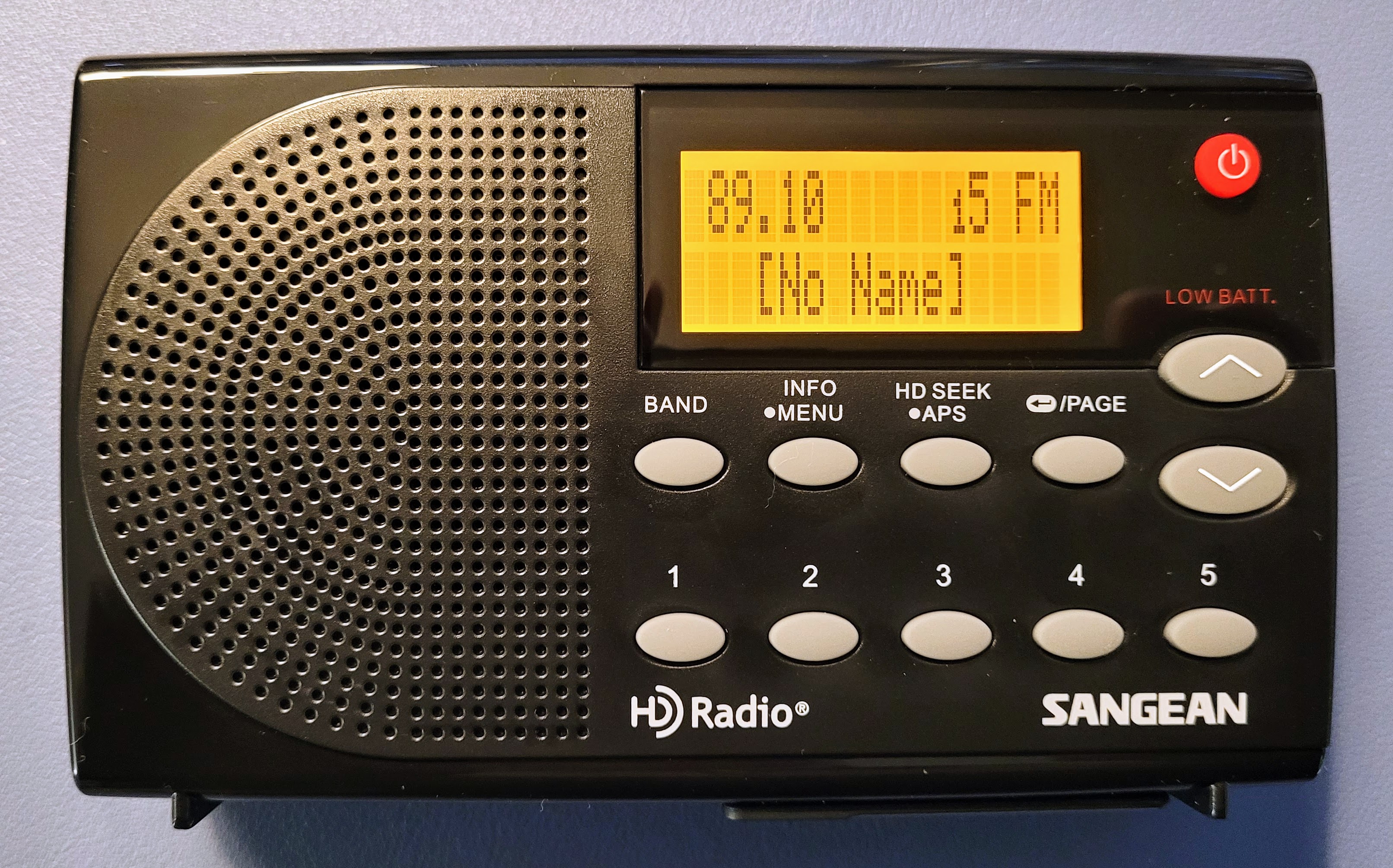 I picked up a portable AM/FM radio from a local store a few days ago. The Sangean HDR-14 “HD Radio™ / AM / FM-RBDS Radio” is a shiny black plastic receiver about the size of two decks of playing cards on top of two decks of cards. You can get it from Amazon.