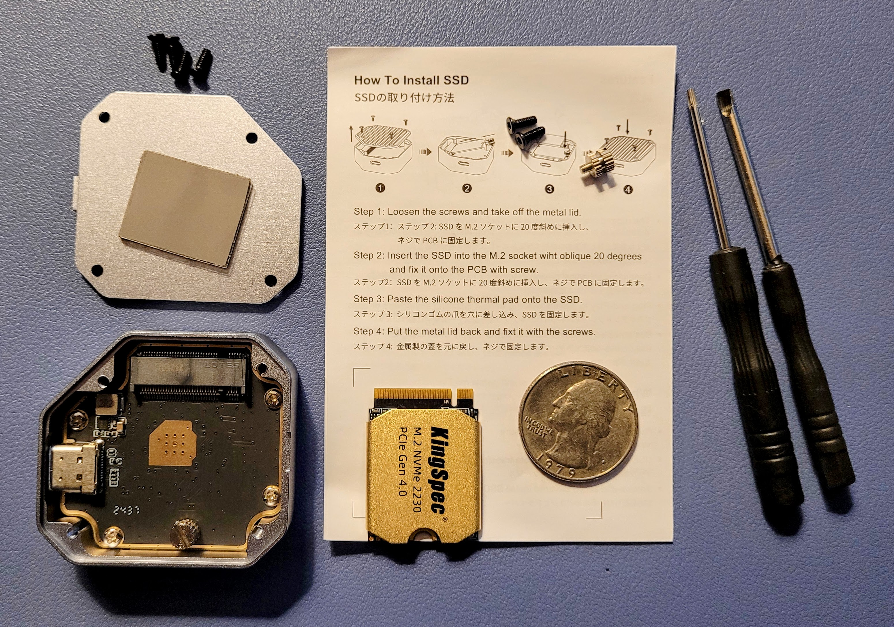 Warning: the screws are small! Also, you might note that the silver toolless screw shown in the image beside step #4 has a channel milled into it. The cutout on the NVMe drive slots into that channel so that the drive is properly aligned and secured in the device.