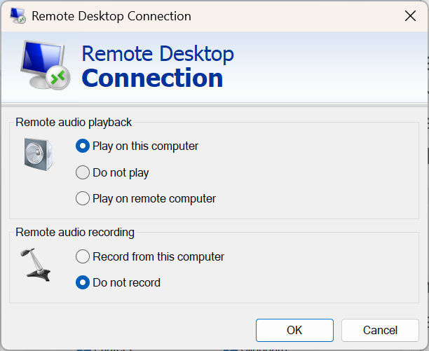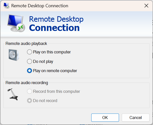 This opens the audio settings screen. The default seems to be to play audio on the remote computer locally. That looks like this: