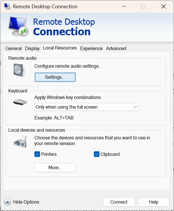 Here’s how to make Remote Desktop Connection work correctly with a WIRES-X node on another computer in your network. Start the Remote Desktop Connection application and at the bottom of the application pop-up display, select the Show Options link. That will open a screen with several tabs. Select the Local Resources tab. In the Remote audio section, click the Settings button: