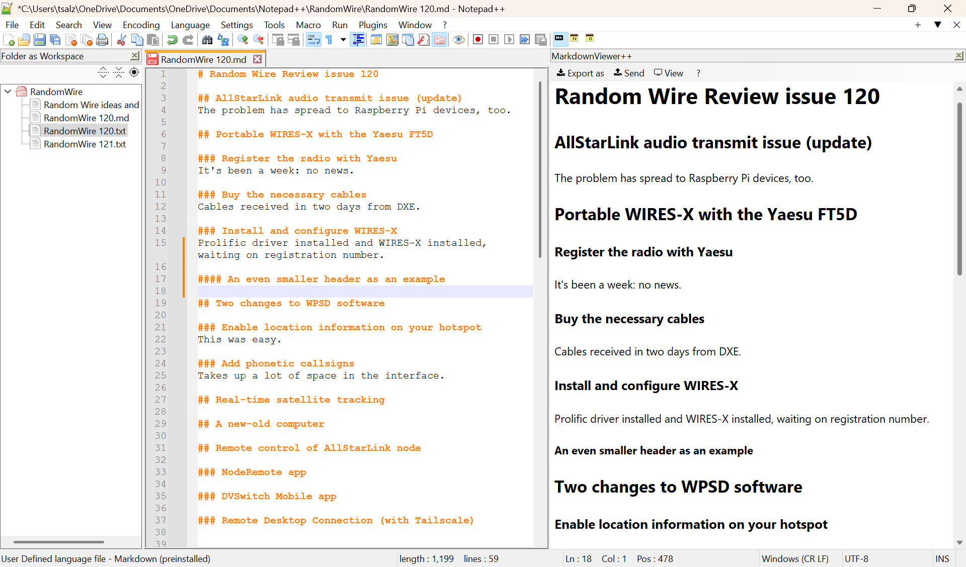 Now add to this my recent dive into looking at Markdown editors which proved less than satisfying. If Notepad++ can handle Markdown and I can store files in a logically organized tree, well, that’s good enough for me.