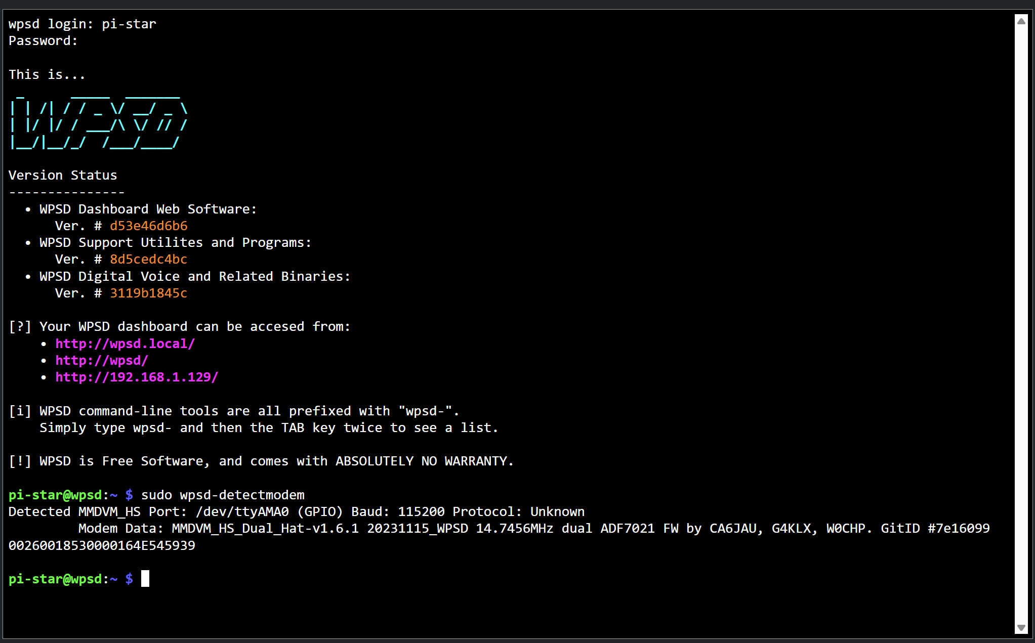 sudo wpsd-detectmodemHere’s what that looked like in the shell window: