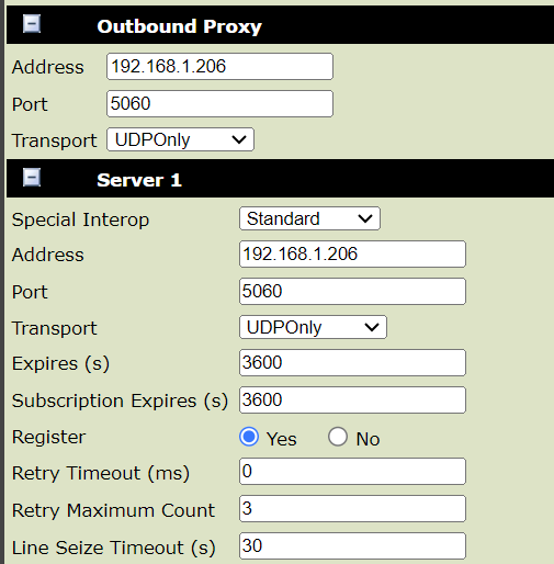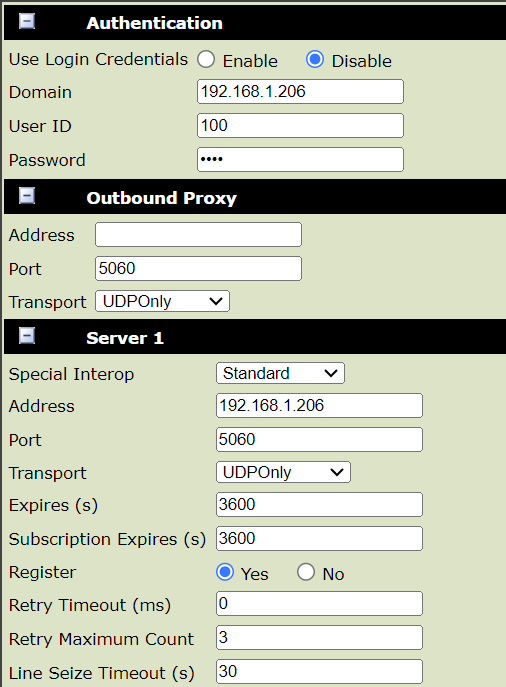 Authentication, Outbound Proxy, and Server 1 settings for Line 1 are: