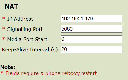 I got quite stuck for a few hours with a failure of the phone to register with Asterisk. Again, running the Asterisk CLI (sudo asterisk -rvvv) gave me the clues I needed to figure out the phone registration problem: Asterisk was simply not seeing the phone, meaning there had to be a setting somewhere that let me specify the phone’s address. I finally found that in NAT settings. This is found under Settings, Network, NAT. The IP address 192.168.1.179 is the address of the Polycom phone.