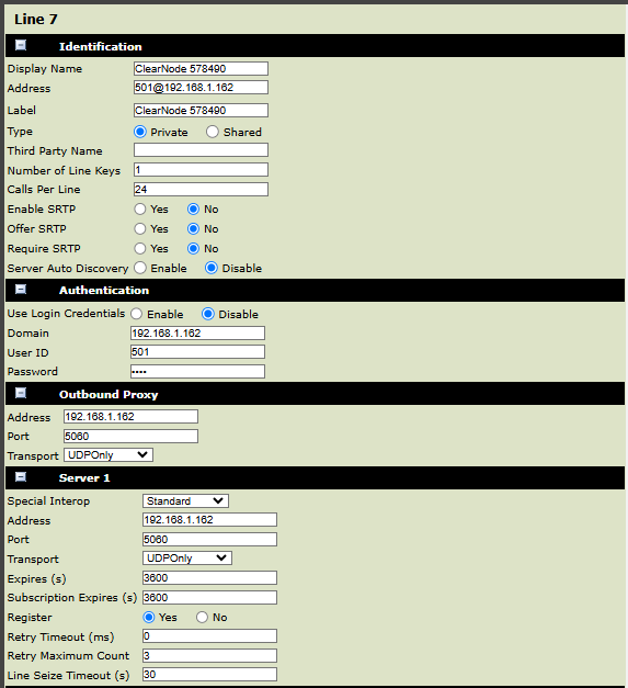 The ClearNode is at IP address 192.168.1.162 on my network. I’m using port 5060 and have specified the UDP protocol.