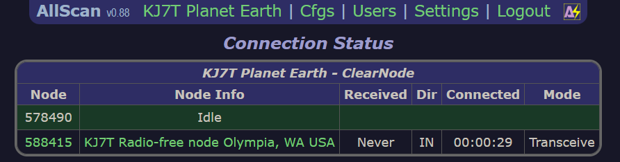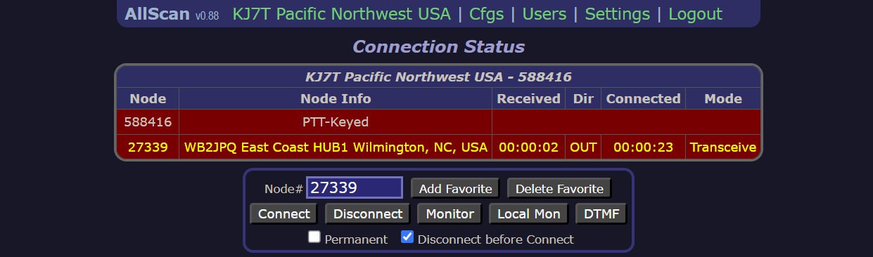 I also have the AllScan favorites management tool installed on my ClearNode. While I can use DTMF codes to make and break connections to other nodes from my SIP phone (for example, dial *351018 to connect to node 51018 and *151018 to disconnect), I prefer using the AllScan interface. It looks like this:
