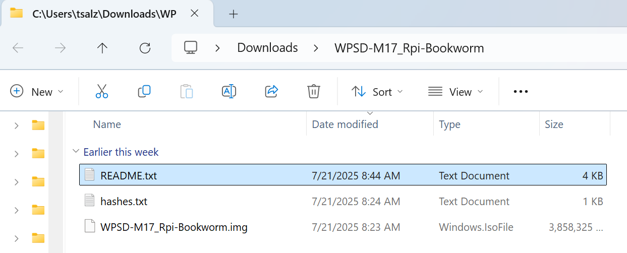 The image file is named WPSD-M17_Rpi-Bookworm.7z. The .7z file extension means it is a 7-Zip file. (Learn more about 7-Zip and get this free, open source program at https://www.7-zip.org/.) You must decompress the zipped file to get the .img file required for burning to a microSD card. My Microsoft Surface 7 laptop running Windows 11 has a microSD slot, making it very easy for me to read and burn cards. I do recommend that you review the README.txt file before proceeding. It has a lot of great information. Here’s what saved to my laptop after decompressing the zipped file: