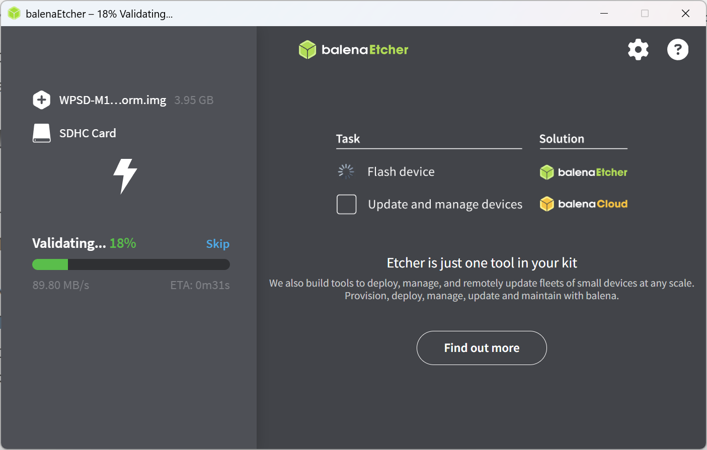 I used balenaEtcher to burn the image to a 32 Gb PNY-brand Class 10 microSD card (it’s what I had on hand). balenaEtcher flashes the image to the card, then verifies the freshly burned image.