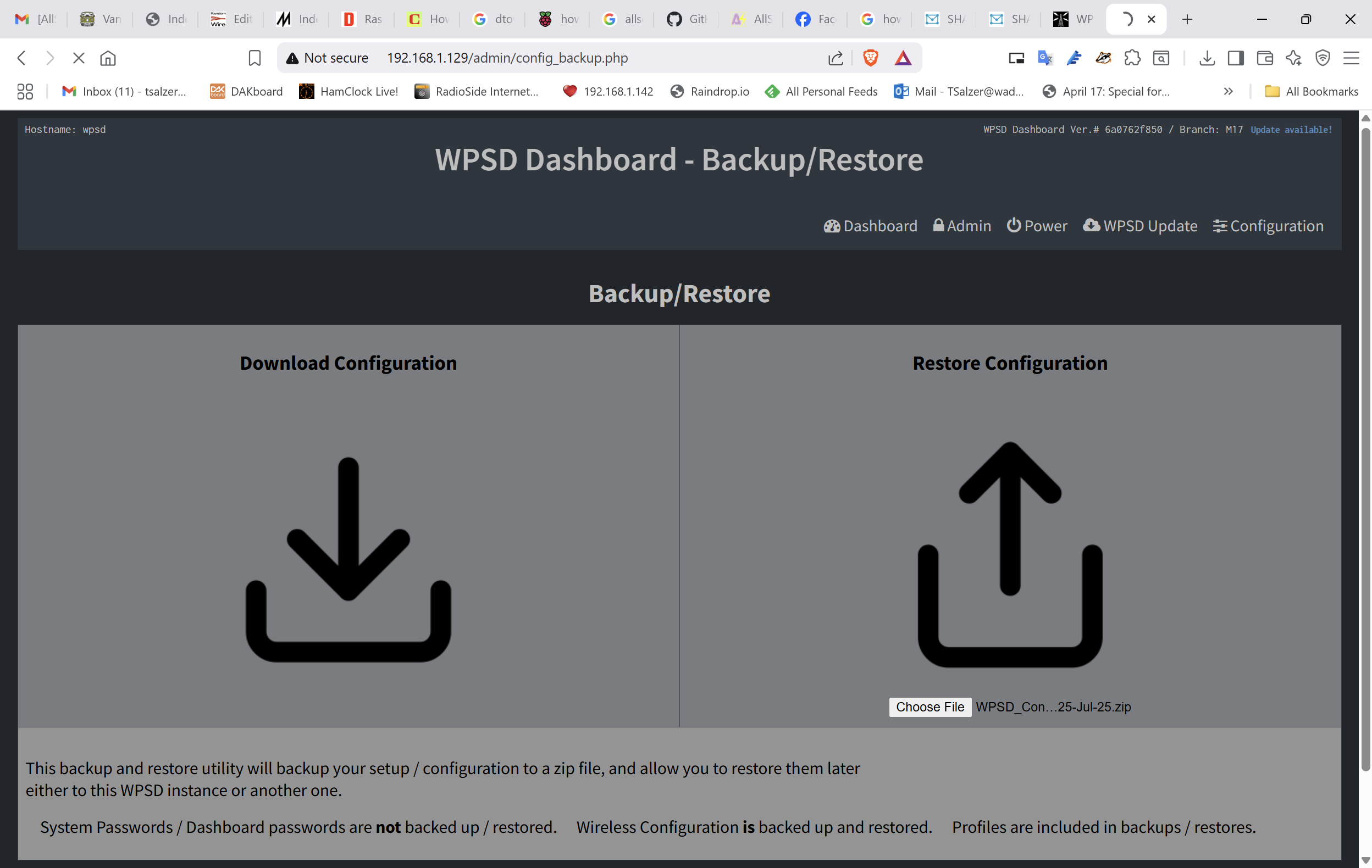 If you had a working WPSD hotspot and you saved a copy of your configuration with the backup/restore dialogue, this is when that saved configuration will come in handy. Go to the backup/restore page, select the Choose File button, and upload your saved config.