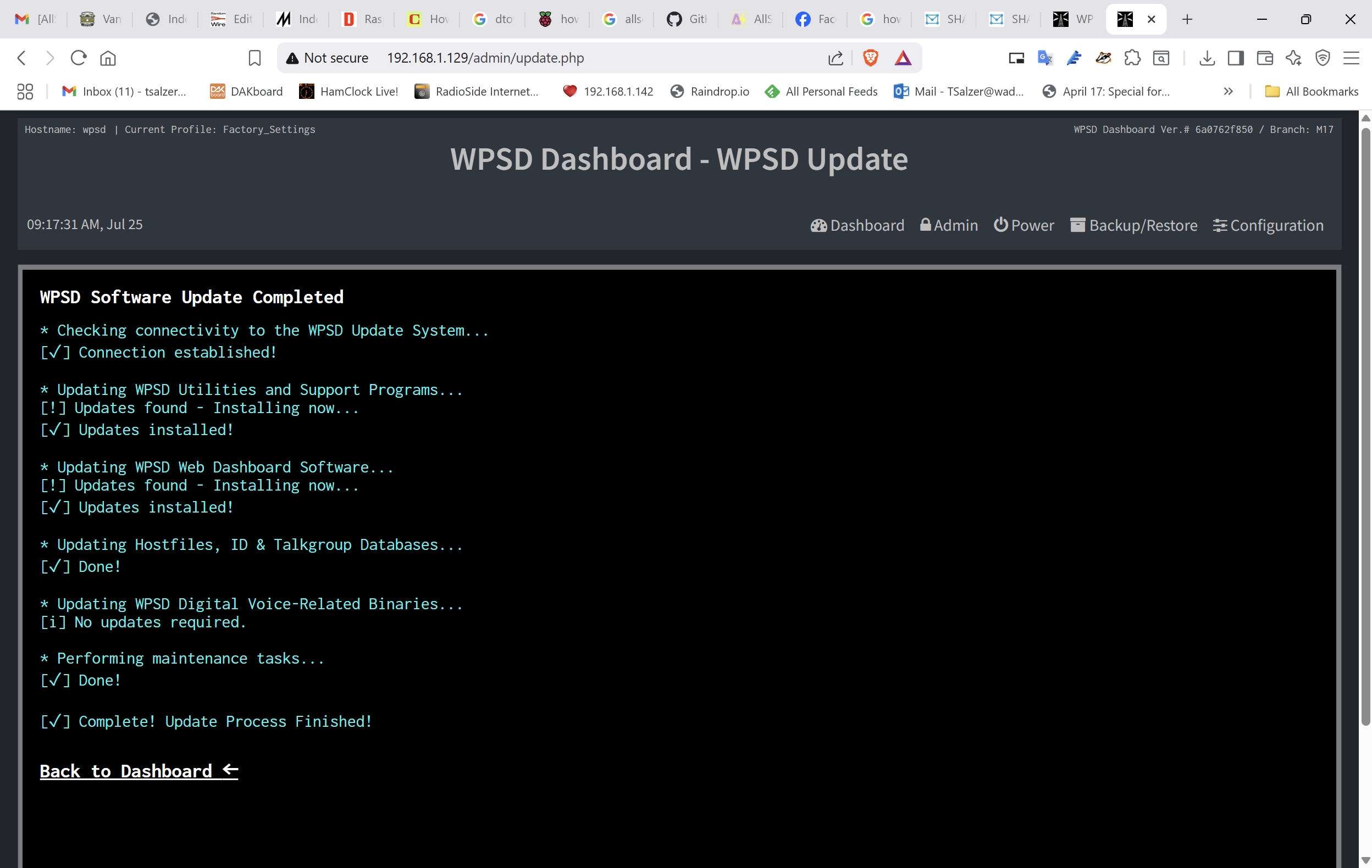 Restoring the saved configuration details can take minutes, so please be patient and let the process continue, even if it looks like nothing is happening. Eventually, you’ll get a notice that says the restoration is complete. At that point, click the Dashboard link and (fingers crossed) find your freshly installed version of WPSD working just like it did before, except now M17 shows up in the left column.